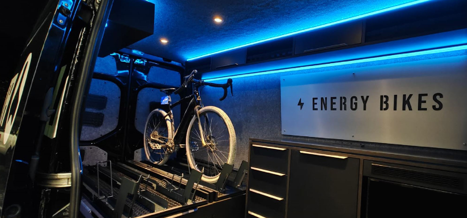Als mobiler Fahrrad-Aussteller mit der entsprechenden Anmutung für die Zielgruppe, wird dieser Mercedes Sprinter im All-Terrain-Style auf Messen und Events eingesetzt. Dabei lassen sich auf zwei Schwerlastauszügen jeweils drei Fahrräder transportieren und frei schwebend aus dem Heck ziehen.